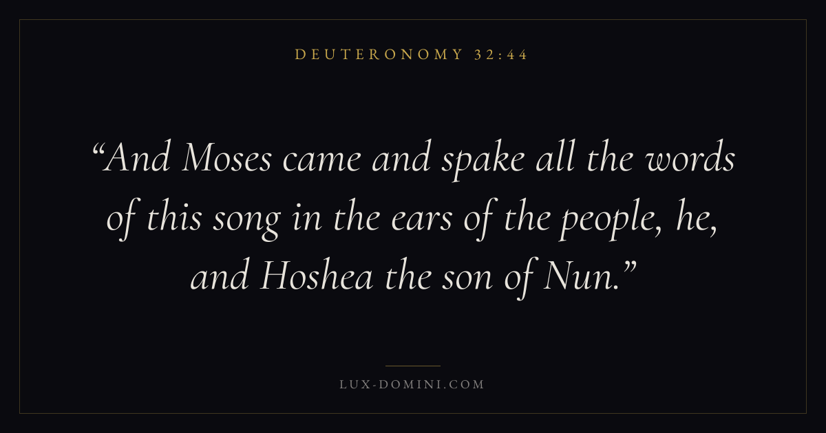 And Moses came and spake all the words of this song in the ears of the people, he, and Hoshea the son of Nun.
