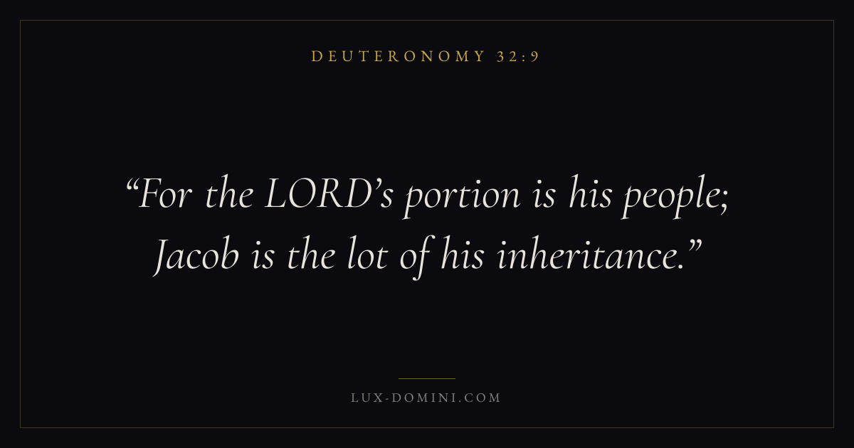 Books / Deuteronomy / Chapter 32 / Verse 9 ← Deuteronomy 32:8 Deuteronomy 32:9 Deuteronomy 32:10 → For the LORD’s portion is his people; Jacob is the lot of his inheritance. Download verse card Share on Twitter Share on Facebook Pin it ✦ Key themes LoveJustice and mercyMemoryCovenant Read with Deuteronomy 32:7Deuteronomy 32:8John 3:161 Corinthians 13:4 Related topics Bible verses about loveBible verses about justice and mercy ✦ Deuteronomy Chapter 32 verses V. 1 V. 2 V. 3 V. 4 V. 5 V. 6 V. 7 V. 8 V. 9 V. 10 V. 11 V. 12 V. 13 V. 14 V. 15 V. 16 V. 17 V. 18 V. 19 V. 20 V. 21 V. 22 V. 23 V. 24 V. 25 V. 26 V. 27 V. 28 V. 29 V. 30 V. 31 V. 32 V. 33 V. 34 V. 35 V. 36 V. 37 V. 38 V. 39 V. 40 V. 41 V. 42 V. 43 V. 44 V. 45 V. 46 V. 47 V. 48 V. 49 V. 50 V. 51 V. 52