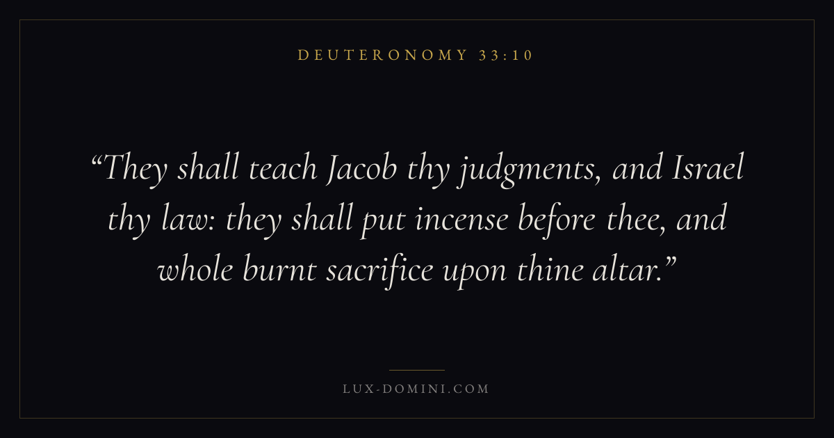 They shall teach Jacob thy judgments, and Israel thy law: they shall put incense before thee, and whole burnt sacrifice upon thine altar.