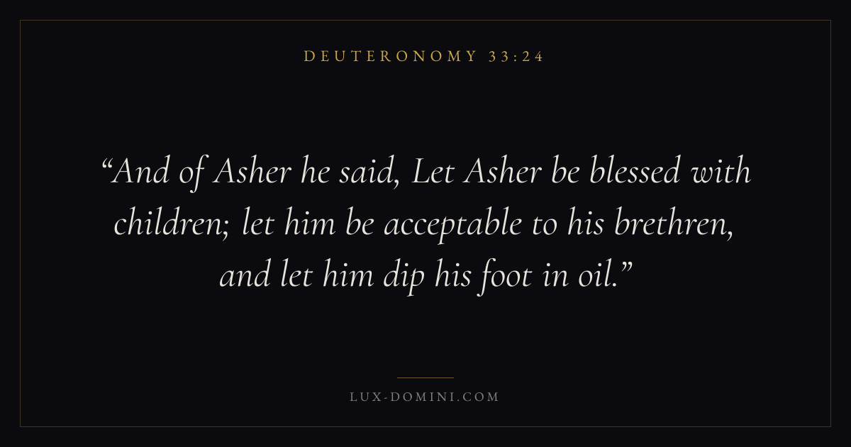And of Asher he said, Let Asher be blessed with children; let him be acceptable to his brethren, and let him dip his foot in oil.