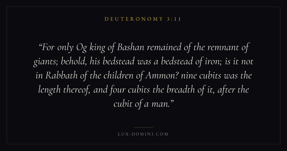 For only Og king of Bashan remained of the remnant of giants; behold, his bedstead was a bedstead of iron; is it not in Rabbath of the children of Ammon? nine cubits was the length thereof, and four cubits the breadth of it, after the cubit of a man.