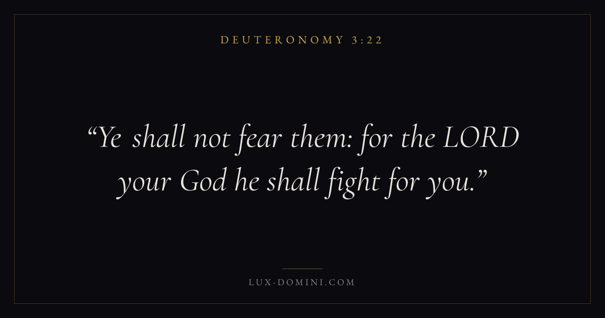 Books / Deuteronomy / Chapter 3 / Verse 22 ← Deuteronomy 3:21 Deuteronomy 3:22 Deuteronomy 3:23 → Ye shall not fear them: for the LORD your God he shall fight for you. Download verse card Share on Twitter Share on Facebook Pin it ✦ Key themes LoveAnxiety and fearMemoryCovenant Read with Deuteronomy 3:21Deuteronomy 3:23John 3:161 Corinthians 13:4 Related topics Bible verses about loveBible verses about anxiety and fear ✦ Deuteronomy Chapter 3 verses V. 1 V. 2 V. 3 V. 4 V. 5 V. 6 V. 7 V. 8 V. 9 V. 10 V. 11 V. 12 V. 13 V. 14 V. 15 V. 16 V. 17 V. 18 V. 19 V. 20 V. 21 V. 22 V. 23 V. 24 V. 25 V. 26 V. 27 V. 28 V. 29