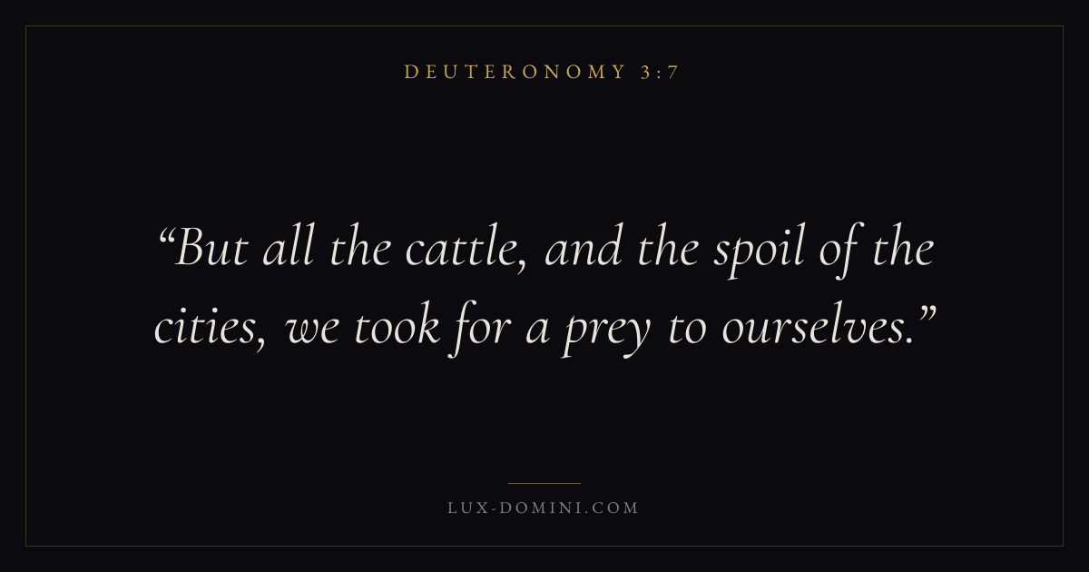 Books / Deuteronomy / Chapter 3 / Verse 7 ← Deuteronomy 3:6 Deuteronomy 3:7 Deuteronomy 3:8 → But all the cattle, and the spoil of the cities, we took for a prey to ourselves. Download verse card Share on Twitter Share on Facebook Pin it ✦ Key themes LovePeaceMemoryCovenant Read with Deuteronomy 3:5Deuteronomy 3:6John 3:161 Corinthians 13:4 Related topics Bible verses about loveBible verses about peace ✦ Deuteronomy Chapter 3 verses V. 1 V. 2 V. 3 V. 4 V. 5 V. 6 V. 7 V. 8 V. 9 V. 10 V. 11 V. 12 V. 13 V. 14 V. 15 V. 16 V. 17 V. 18 V. 19 V. 20 V. 21 V. 22 V. 23 V. 24 V. 25 V. 26 V. 27 V. 28 V. 29