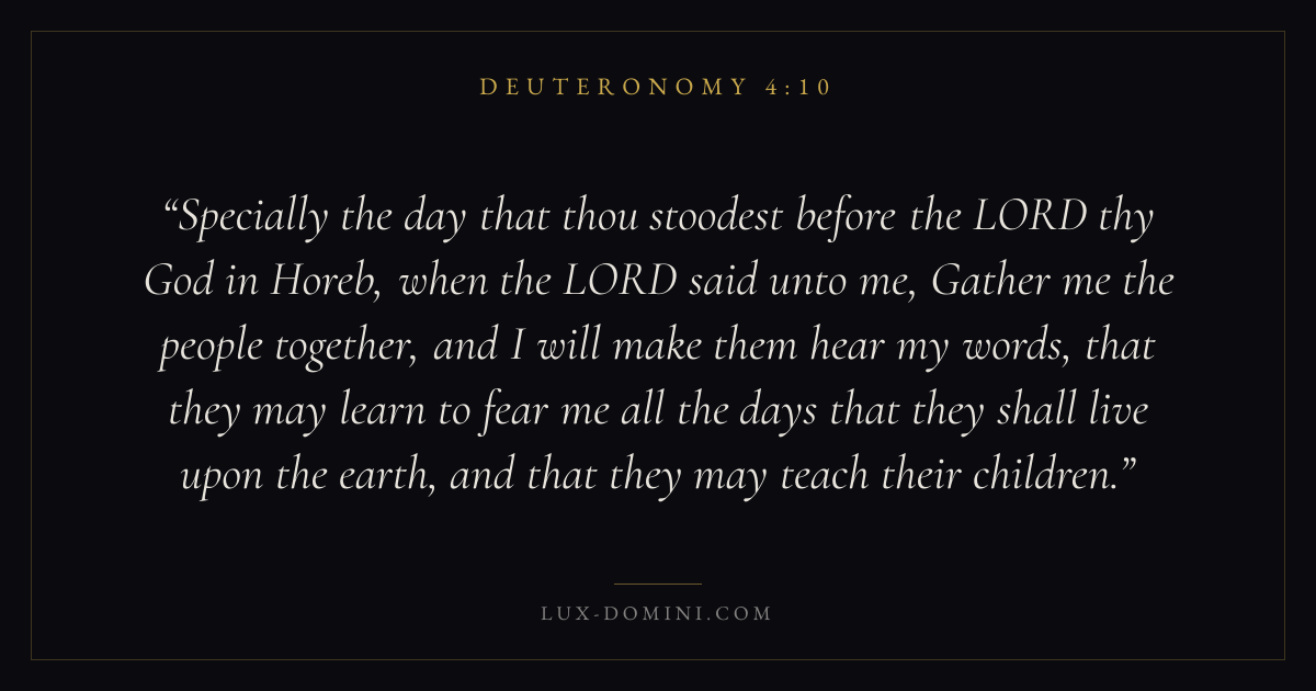 Specially the day that thou stoodest before the LORD thy God in Horeb, when the LORD said unto me, Gather me the people together, and I will make them hear my words, that they may learn to fear me all the days that they shall live upon the earth, and that they may teach their children.