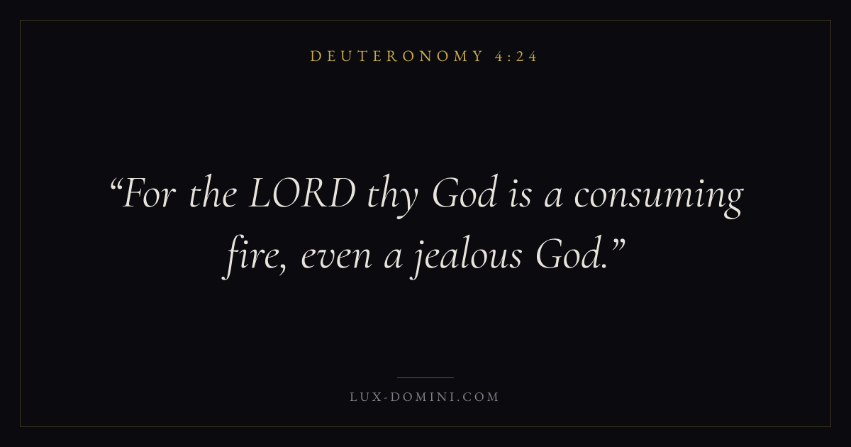 Books / Deuteronomy / Chapter 4 / Verse 24 ← Deuteronomy 4:23 Deuteronomy 4:24 Deuteronomy 4:25 → For the LORD thy God is a consuming fire, even a jealous God. Download verse card Share on Twitter Share on Facebook Pin it ✦ Key themes LoveMemoryCovenantLove of God Read with Deuteronomy 4:23John 3:161 Corinthians 13:4 Related topics Bible verses about love ✦ Deuteronomy Chapter 4 verses V. 1 V. 2 V. 3 V. 4 V. 5 V. 6 V. 7 V. 8 V. 9 V. 10 V. 11 V. 12 V. 13 V. 14 V. 15 V. 16 V. 17 V. 18 V. 19 V. 20 V. 21 V. 22 V. 23 V. 24 V. 25 V. 26 V. 27 V. 28 V. 29 V. 30 V. 31 V. 32 V. 33 V. 34 V. 35 V. 36 V. 37 V. 38 V. 39 V. 40 V. 41 V. 42 V. 43 V. 44 V. 45 V. 46 V. 47 V. 48 V. 49