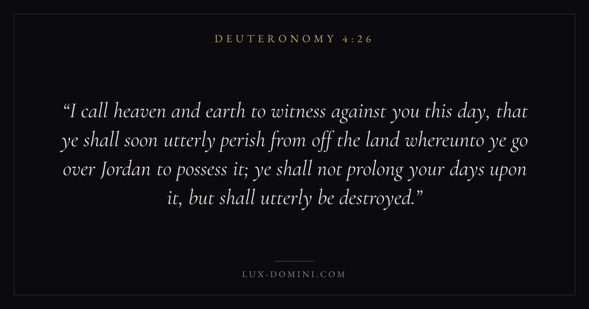 I call heaven and earth to witness against you this day, that ye shall soon utterly perish from off the land whereunto ye go over Jordan to possess it; ye shall not prolong your days upon it, but shall utterly be destroyed.