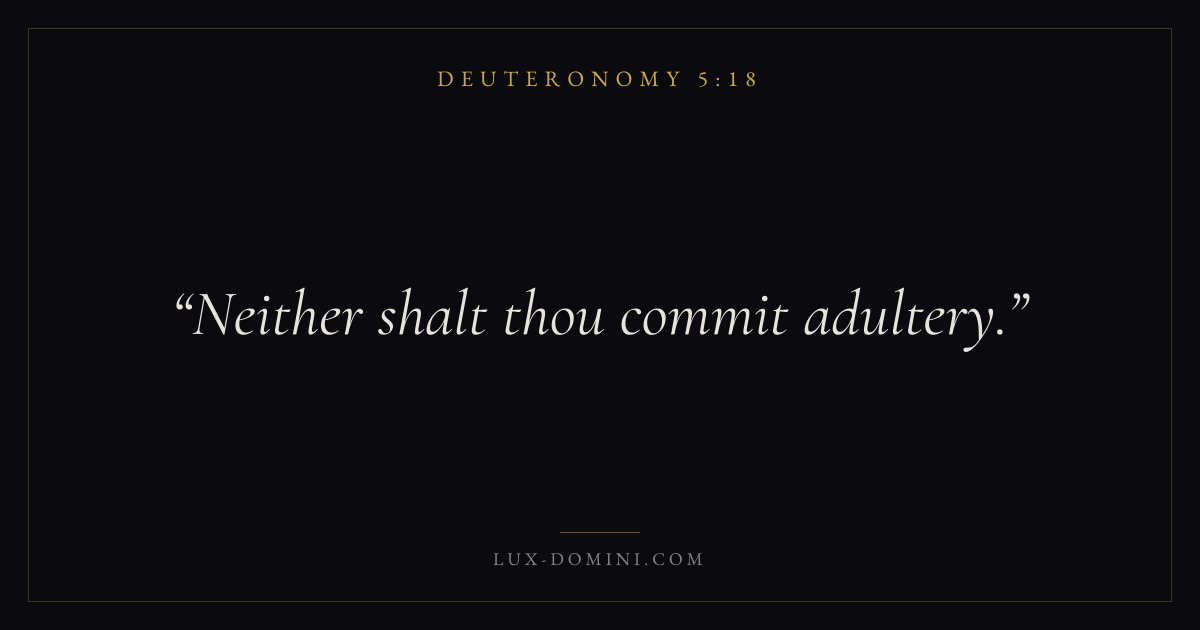 Books / Deuteronomy / Chapter 5 / Verse 18 ← Deuteronomy 5:17 Deuteronomy 5:18 Deuteronomy 5:19 → Neither shalt thou commit adultery. Download verse card Share on Twitter Share on Facebook Pin it ✦ Key themes LovePrayerMemoryCovenant Read with Deuteronomy 5:17Deuteronomy 5:19John 3:161 Corinthians 13:4 Related topics Bible verses about loveBible verses about prayer ✦ Deuteronomy Chapter 5 verses V. 1 V. 2 V. 3 V. 4 V. 5 V. 6 V. 7 V. 8 V. 9 V. 10 V. 11 V. 12 V. 13 V. 14 V. 15 V. 16 V. 17 V. 18 V. 19 V. 20 V. 21 V. 22 V. 23 V. 24 V. 25 V. 26 V. 27 V. 28 V. 29 V. 30 V. 31 V. 32 V. 33