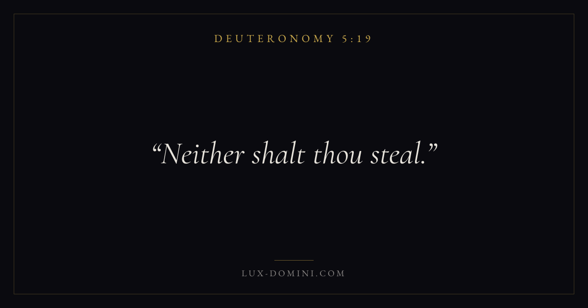 Books / Deuteronomy / Chapter 5 / Verse 19 ← Deuteronomy 5:18 Deuteronomy 5:19 Deuteronomy 5:20 → Neither shalt thou steal. Download verse card Share on Twitter Share on Facebook Pin it ✦ Key themes LovePrayerMemoryCovenant Read with Deuteronomy 5:17Deuteronomy 5:18John 3:161 Corinthians 13:4 Related topics Bible verses about loveBible verses about prayer ✦ Deuteronomy Chapter 5 verses V. 1 V. 2 V. 3 V. 4 V. 5 V. 6 V. 7 V. 8 V. 9 V. 10 V. 11 V. 12 V. 13 V. 14 V. 15 V. 16 V. 17 V. 18 V. 19 V. 20 V. 21 V. 22 V. 23 V. 24 V. 25 V. 26 V. 27 V. 28 V. 29 V. 30 V. 31 V. 32 V. 33