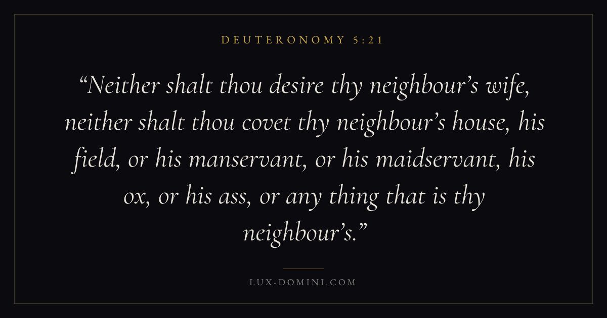Neither shalt thou desire thy neighbour’s wife, neither shalt thou covet thy neighbour’s house, his field, or his manservant, or his maidservant, his ox, or his ass, or any thing that is thy neighbour’s.