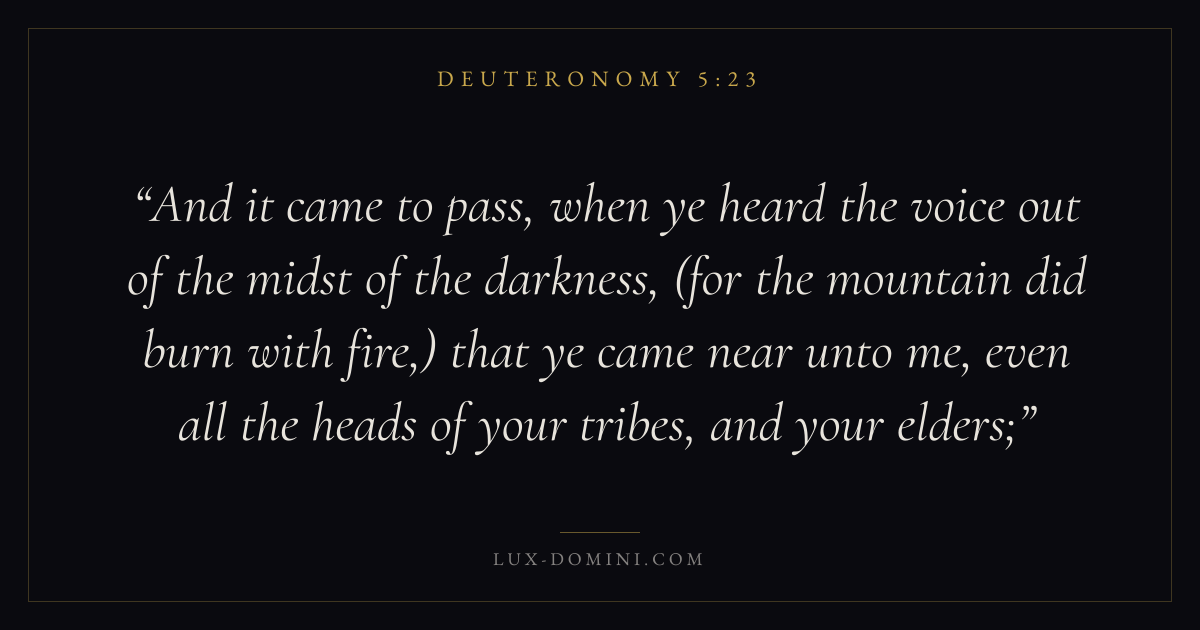 And it came to pass, when ye heard the voice out of the midst of the darkness, (for the mountain did burn with fire,) that ye came near unto me, even all the heads of your tribes, and your elders;