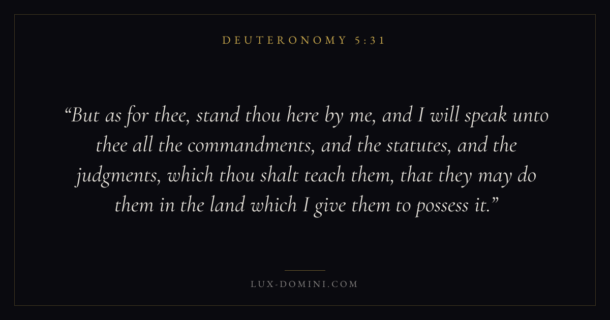 But as for thee, stand thou here by me, and I will speak unto thee all the commandments, and the statutes, and the judgments, which thou shalt teach them, that they may do them in the land which I give them to possess it.