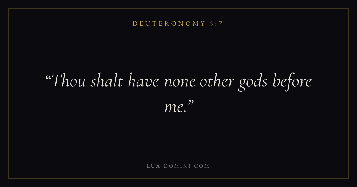 Books / Deuteronomy / Chapter 5 / Verse 7 ← Deuteronomy 5:6 Deuteronomy 5:7 Deuteronomy 5:8 → Thou shalt have none other gods before me. Download verse card Share on Twitter Share on Facebook Pin it ✦ Key themes LovePrayerMemoryCovenant Read with Deuteronomy 5:6John 3:161 Corinthians 13:4Matthew 6:9 Related topics Bible verses about loveBible verses about prayer ✦ Deuteronomy Chapter 5 verses V. 1 V. 2 V. 3 V. 4 V. 5 V. 6 V. 7 V. 8 V. 9 V. 10 V. 11 V. 12 V. 13 V. 14 V. 15 V. 16 V. 17 V. 18 V. 19 V. 20 V. 21 V. 22 V. 23 V. 24 V. 25 V. 26 V. 27 V. 28 V. 29 V. 30 V. 31 V. 32 V. 33