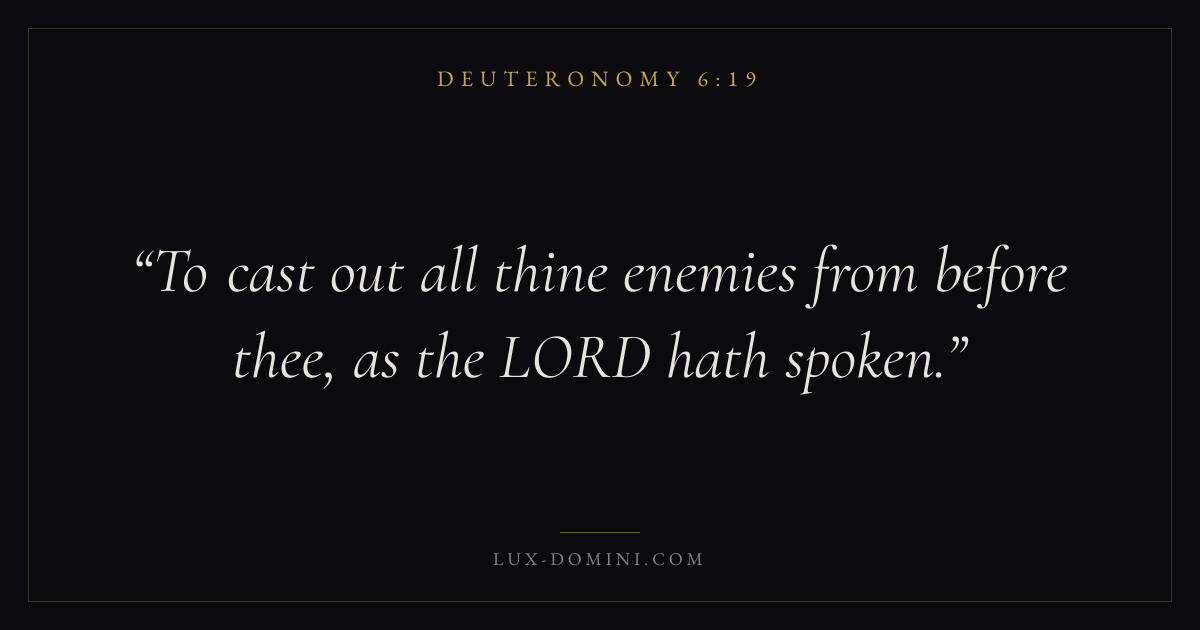 Books / Deuteronomy / Chapter 6 / Verse 19 ← Deuteronomy 6:18 Deuteronomy 6:19 Deuteronomy 6:20 → To cast out all thine enemies from before thee, as the LORD hath spoken. Download verse card Share on Twitter Share on Facebook Pin it ✦ Key themes LoveMemoryCovenantLove of God Read with Deuteronomy 6:17Deuteronomy 6:18John 3:161 Corinthians 13:4 Related topics Bible verses about love ✦ Deuteronomy Chapter 6 verses V. 1 V. 2 V. 3 V. 4 V. 5 V. 6 V. 7 V. 8 V. 9 V. 10 V. 11 V. 12 V. 13 V. 14 V. 15 V. 16 V. 17 V. 18 V. 19 V. 20 V. 21 V. 22 V. 23 V. 24 V. 25