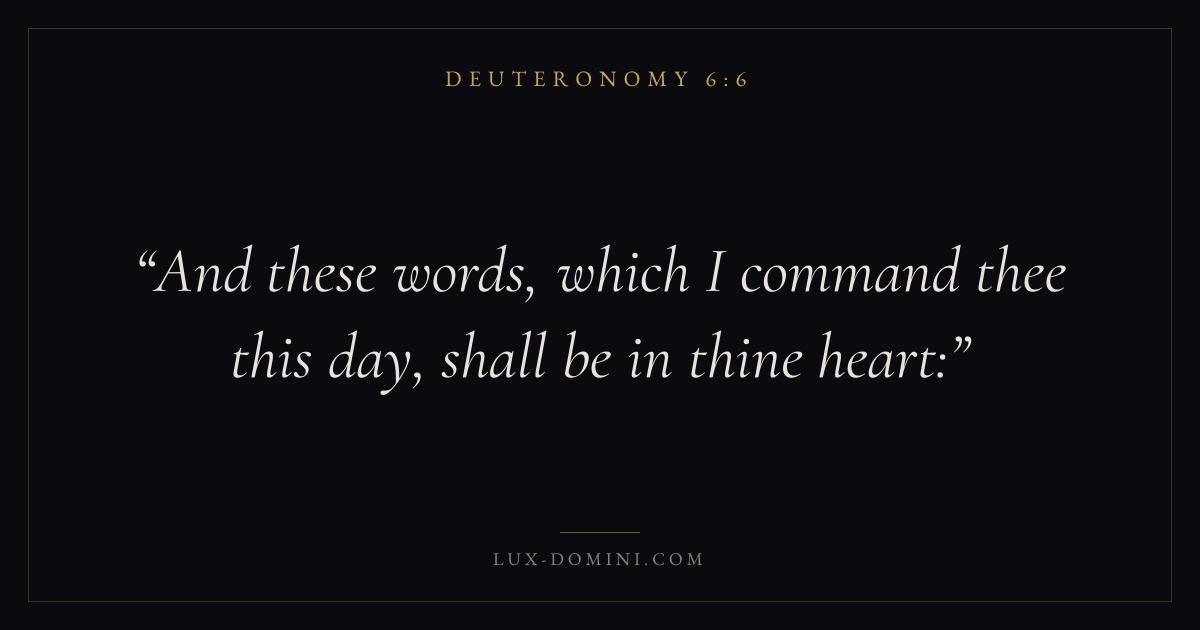 Books / Deuteronomy / Chapter 6 / Verse 6 ← Deuteronomy 6:5 Deuteronomy 6:6 Deuteronomy 6:7 → And these words, which I command thee this day, shall be in thine heart: Download verse card Share on Twitter Share on Facebook Pin it ✦ Key themes LoveMemoryCovenantLove of God Read with Deuteronomy 6:4Deuteronomy 6:5John 3:161 Corinthians 13:4 Related topics Bible verses for fathersBible verses about love ✦ Deuteronomy Chapter 6 verses V. 1 V. 2 V. 3 V. 4 V. 5 V. 6 V. 7 V. 8 V. 9 V. 10 V. 11 V. 12 V. 13 V. 14 V. 15 V. 16 V. 17 V. 18 V. 19 V. 20 V. 21 V. 22 V. 23 V. 24 V. 25