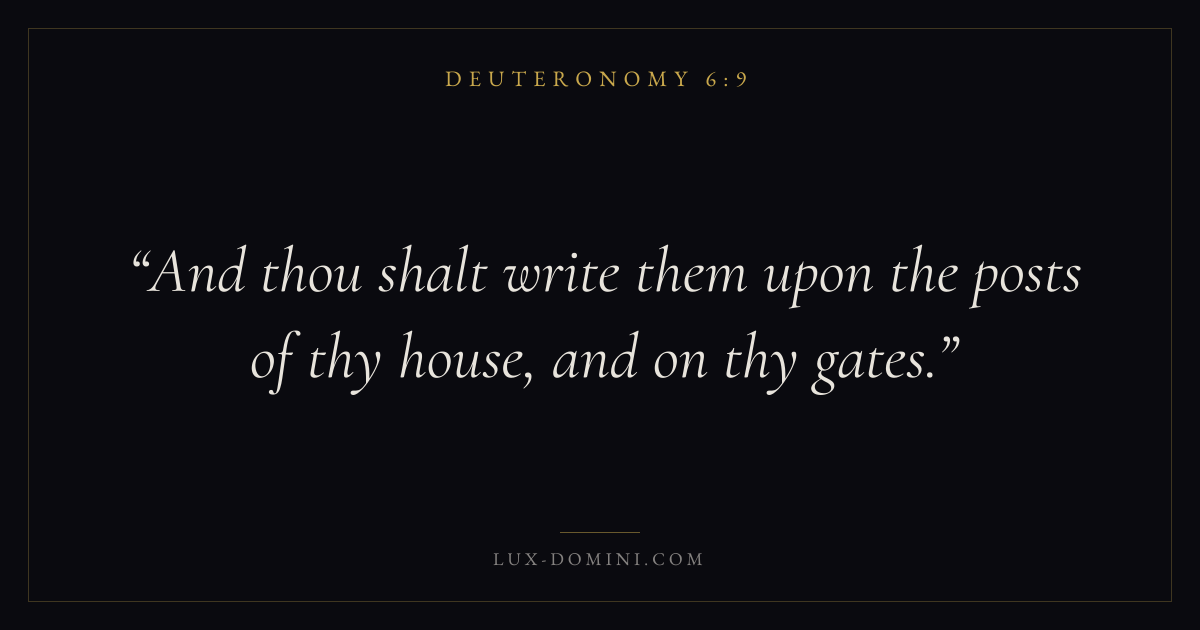 Books / Deuteronomy / Chapter 6 / Verse 9 ← Deuteronomy 6:8 Deuteronomy 6:9 Deuteronomy 6:10 → And thou shalt write them upon the posts of thy house, and on thy gates. Download verse card Share on Twitter Share on Facebook Pin it ✦ Key themes LoveMemoryCovenantLove of God Read with Deuteronomy 6:10Deuteronomy 6:11John 3:161 Corinthians 13:4 Related topics Bible verses about love ✦ Deuteronomy Chapter 6 verses V. 1 V. 2 V. 3 V. 4 V. 5 V. 6 V. 7 V. 8 V. 9 V. 10 V. 11 V. 12 V. 13 V. 14 V. 15 V. 16 V. 17 V. 18 V. 19 V. 20 V. 21 V. 22 V. 23 V. 24 V. 25