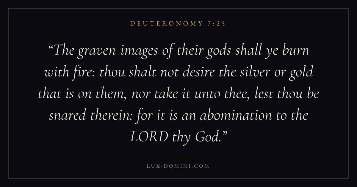 The graven images of their gods shall ye burn with fire: thou shalt not desire the silver or gold that is on them, nor take it unto thee, lest thou be snared therein: for it is an abomination to the LORD thy God.