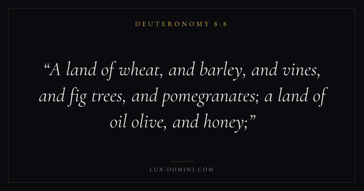 A land of wheat, and barley, and vines, and fig trees, and pomegranates; a land of oil olive, and honey;