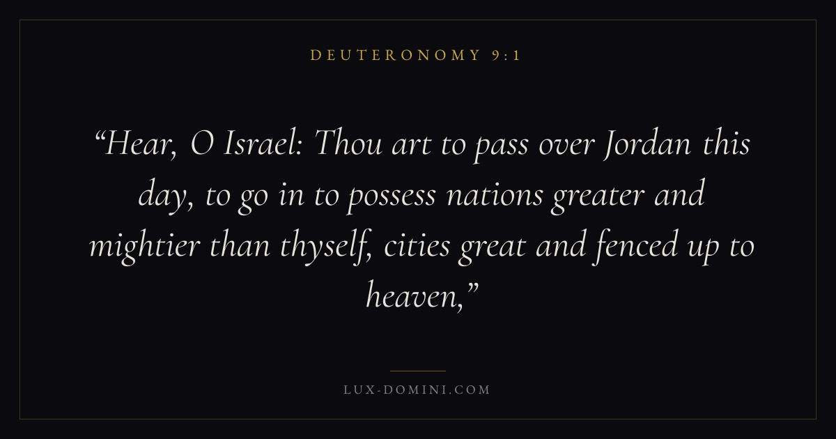 Hear, O Israel: Thou art to pass over Jordan this day, to go in to possess nations greater and mightier than thyself, cities great and fenced up to heaven,