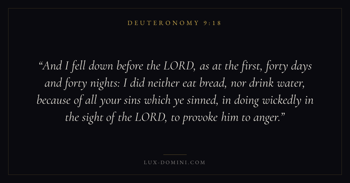And I fell down before the LORD, as at the first, forty days and forty nights: I did neither eat bread, nor drink water, because of all your sins which ye sinned, in doing wickedly in the sight of the LORD, to provoke him to anger.