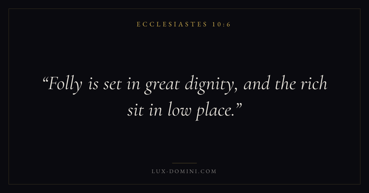 Books / Ecclesiastes / Chapter 10 / Verse 6 ← Ecclesiastes 10:5 Ecclesiastes 10:6 Ecclesiastes 10:7 → Folly is set in great dignity, and the rich sit in low place. Download verse card Share on Twitter Share on Facebook Pin it ✦ Key themes HopeWisdomHumilityVanity Read with Ecclesiastes 10:4Ecclesiastes 10:5Romans 8:24Revelation 21:4 Related topics Bible verses about hopeBible verses about wisdomBible verses about humility ✦ Ecclesiastes Chapter 10 verses V. 1 V. 2 V. 3 V. 4 V. 5 V. 6 V. 7 V. 8 V. 9 V. 10 V. 11 V. 12 V. 13 V. 14 V. 15 V. 16 V. 17 V. 18 V. 19 V. 20