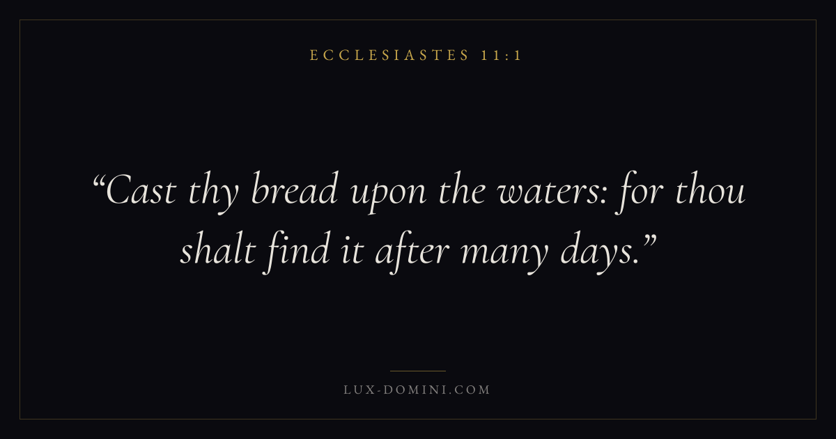 Books / Ecclesiastes / Chapter 11 / Verse 1 ← Ecclesiastes 10:20 Ecclesiastes 11:1 Ecclesiastes 11:2 → Cast thy bread upon the waters: for thou shalt find it after many days. Download verse card Share on Twitter Share on Facebook Pin it ✦ Key themes WisdomVanityTimeDeath Read with Ecclesiastes 11:2Proverbs 1:7James 1:5 Related topics Bible verses about wisdomBible verses about death and dying ✦ Ecclesiastes Chapter 11 verses V. 1 V. 2 V. 3 V. 4 V. 5 V. 6 V. 7 V. 8 V. 9 V. 10