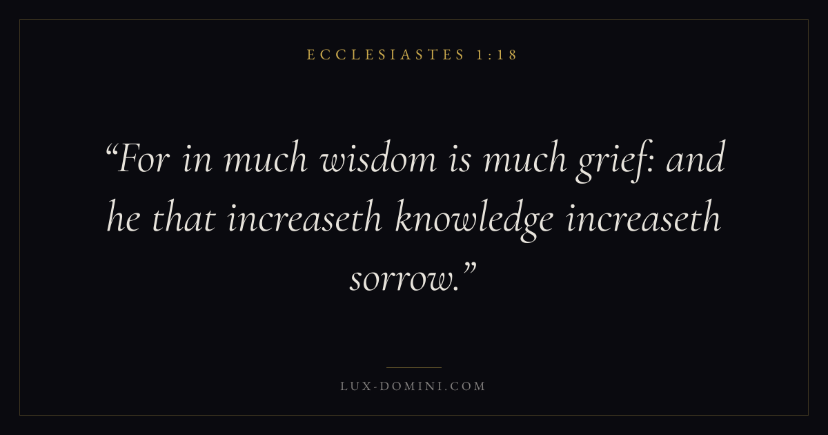 Books / Ecclesiastes / Chapter 1 / Verse 18 ← Ecclesiastes 1:17 Ecclesiastes 1:18 Ecclesiastes 2:1 → For in much wisdom is much grief: and he that increaseth knowledge increaseth sorrow. Download verse card Share on Twitter Share on Facebook Pin it ✦ Key themes Suffering and trialsWisdomVanityTime Read with Ecclesiastes 1:16Ecclesiastes 1:17Romans 8:182 Corinthians 4:17 Related topics Bible verses about suffering and trialsBible verses about wisdom ✦ Ecclesiastes Chapter 1 verses V. 1 V. 2 V. 3 V. 4 V. 5 V. 6 V. 7 V. 8 V. 9 V. 10 V. 11 V. 12 V. 13 V. 14 V. 15 V. 16 V. 17 V. 18