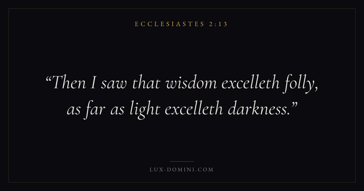 Books / Ecclesiastes / Chapter 2 / Verse 13 ← Ecclesiastes 2:12 Ecclesiastes 2:13 Ecclesiastes 2:14 → Then I saw that wisdom excelleth folly, as far as light excelleth darkness. Download verse card Share on Twitter Share on Facebook Pin it ✦ Key themes WisdomVanityTimeDeath Read with Ecclesiastes 2:12Ecclesiastes 2:14Proverbs 1:7James 1:5 Related topics Bible verses about wisdomBible verses about death and dying ✦ Ecclesiastes Chapter 2 verses V. 1 V. 2 V. 3 V. 4 V. 5 V. 6 V. 7 V. 8 V. 9 V. 10 V. 11 V. 12 V. 13 V. 14 V. 15 V. 16 V. 17 V. 18 V. 19 V. 20 V. 21 V. 22 V. 23 V. 24 V. 25 V. 26
