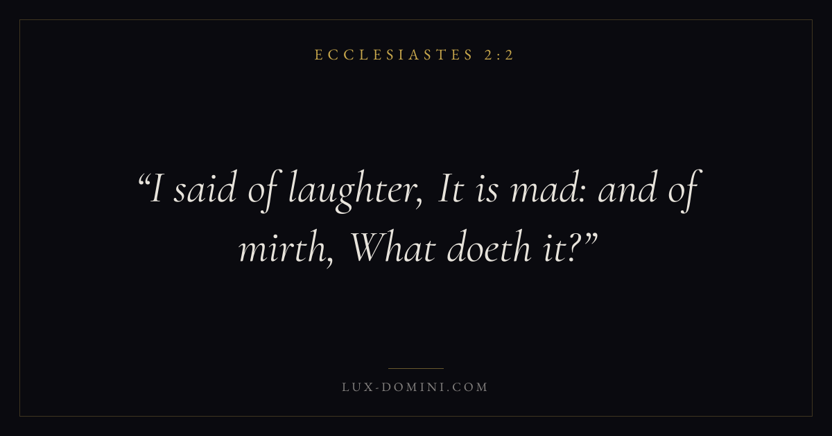 Books / Ecclesiastes / Chapter 2 / Verse 2 ← Ecclesiastes 2:1 Ecclesiastes 2:2 Ecclesiastes 2:3 → I said of laughter, It is mad: and of mirth, What doeth it? Download verse card Share on Twitter Share on Facebook Pin it ✦ Key themes WisdomVanityTimeDeath Read with Ecclesiastes 2:1Ecclesiastes 2:3Proverbs 1:7James 1:5 Related topics Bible verses about wisdomBible verses about death and dying ✦ Ecclesiastes Chapter 2 verses V. 1 V. 2 V. 3 V. 4 V. 5 V. 6 V. 7 V. 8 V. 9 V. 10 V. 11 V. 12 V. 13 V. 14 V. 15 V. 16 V. 17 V. 18 V. 19 V. 20 V. 21 V. 22 V. 23 V. 24 V. 25 V. 26