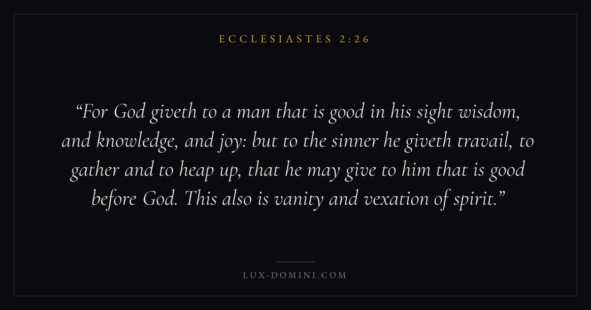 For God giveth to a man that is good in his sight wisdom, and knowledge, and joy: but to the sinner he giveth travail, to gather and to heap up, that he may give to him that is good before God. This also is vanity and vexation of spirit.
