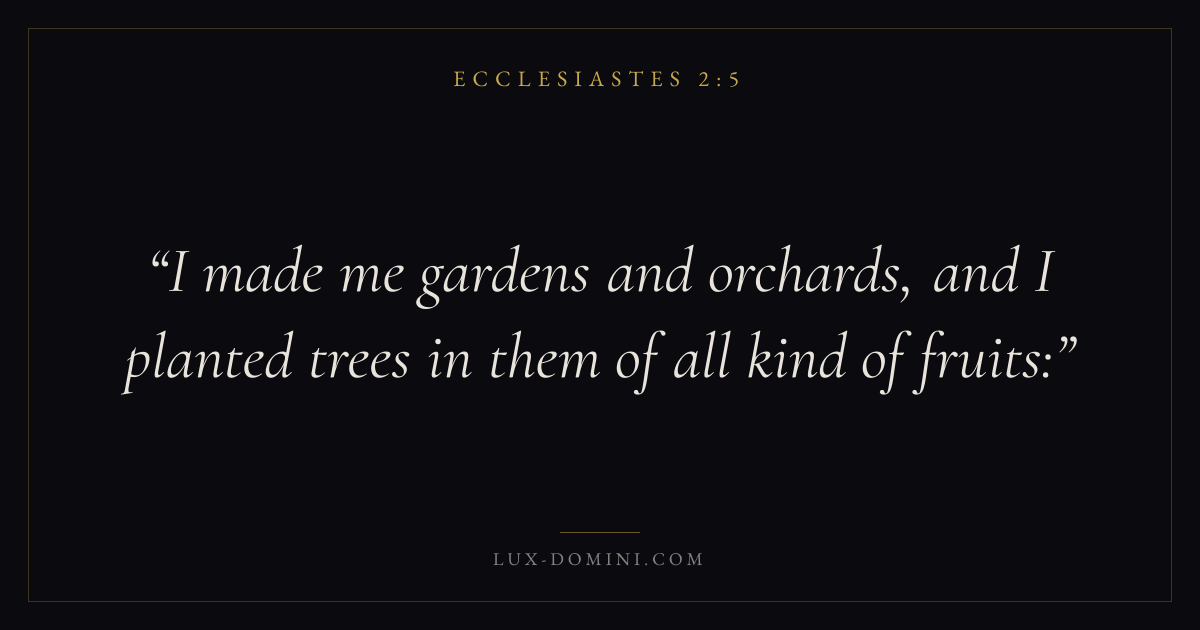 Books / Ecclesiastes / Chapter 2 / Verse 5 ← Ecclesiastes 2:4 Ecclesiastes 2:5 Ecclesiastes 2:6 → I made me gardens and orchards, and I planted trees in them of all kind of fruits: Download verse card Share on Twitter Share on Facebook Pin it ✦ Key themes WisdomVanityTimeDeath Read with Ecclesiastes 2:4Ecclesiastes 2:6Proverbs 1:7James 1:5 Related topics Bible verses about wisdomBible verses about death and dying ✦ Ecclesiastes Chapter 2 verses V. 1 V. 2 V. 3 V. 4 V. 5 V. 6 V. 7 V. 8 V. 9 V. 10 V. 11 V. 12 V. 13 V. 14 V. 15 V. 16 V. 17 V. 18 V. 19 V. 20 V. 21 V. 22 V. 23 V. 24 V. 25 V. 26