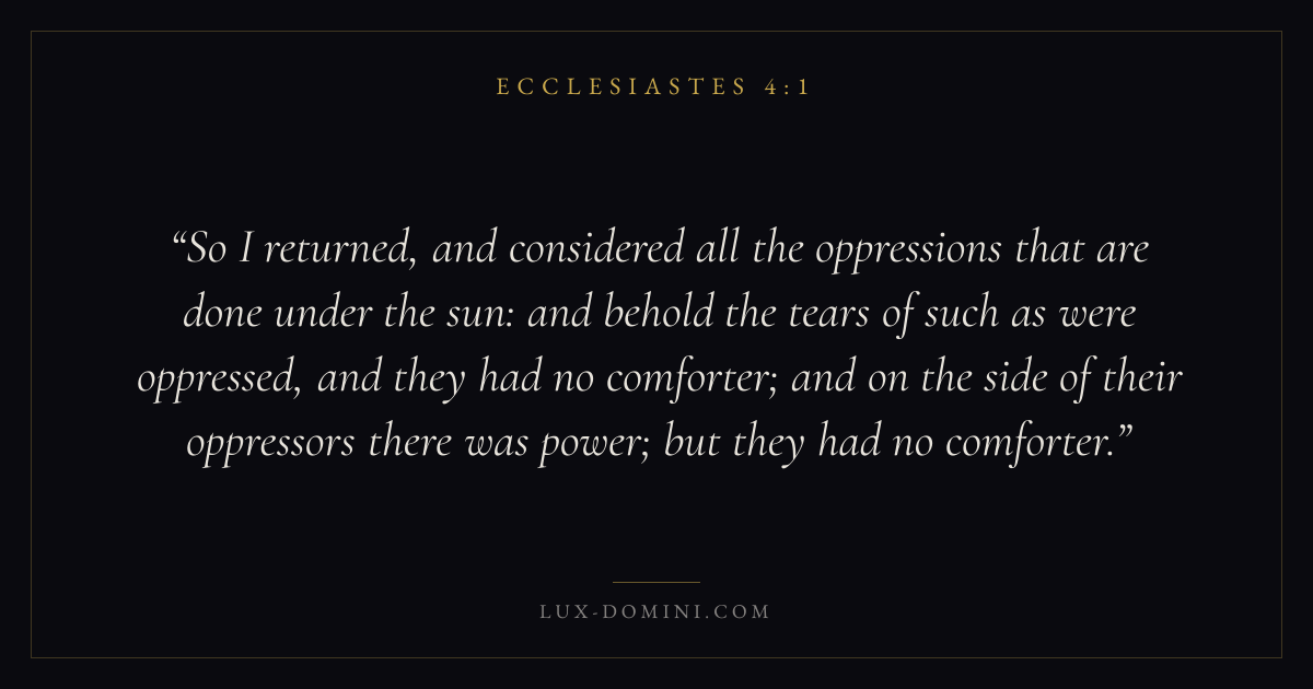 So I returned, and considered all the oppressions that are done under the sun: and behold the tears of such as were oppressed, and they had no comforter; and on the side of their oppressors there was power; but they had no comforter.
