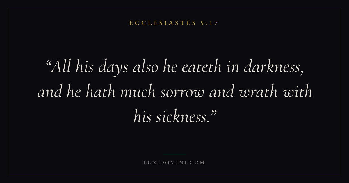 Books / Ecclesiastes / Chapter 5 / Verse 17 ← Ecclesiastes 5:16 Ecclesiastes 5:17 Ecclesiastes 5:18 → All his days also he eateth in darkness, and he hath much sorrow and wrath with his sickness. Download verse card Share on Twitter Share on Facebook Pin it ✦ Key themes WisdomJustice and mercyVanityTime Read with Ecclesiastes 5:15Ecclesiastes 5:16Proverbs 1:7James 1:5 Related topics Bible verses about wisdomBible verses about justice and mercy ✦ Ecclesiastes Chapter 5 verses V. 1 V. 2 V. 3 V. 4 V. 5 V. 6 V. 7 V. 8 V. 9 V. 10 V. 11 V. 12 V. 13 V. 14 V. 15 V. 16 V. 17 V. 18 V. 19 V. 20