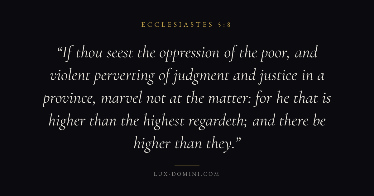 If thou seest the oppression of the poor, and violent perverting of judgment and justice in a province, marvel not at the matter: for he that is higher than the highest regardeth; and there be higher than they.
