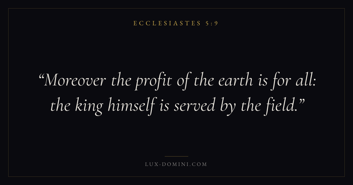 Books / Ecclesiastes / Chapter 5 / Verse 9 ← Ecclesiastes 5:8 Ecclesiastes 5:9 Ecclesiastes 5:10 → Moreover the profit of the earth is for all: the king himself is served by the field. Download verse card Share on Twitter Share on Facebook Pin it ✦ Key themes WisdomJustice and mercyVanityTime Read with Ecclesiastes 5:10Proverbs 1:7James 1:5Micah 6:8 Related topics Bible verses about wisdomBible verses about justice and mercy ✦ Ecclesiastes Chapter 5 verses V. 1 V. 2 V. 3 V. 4 V. 5 V. 6 V. 7 V. 8 V. 9 V. 10 V. 11 V. 12 V. 13 V. 14 V. 15 V. 16 V. 17 V. 18 V. 19 V. 20