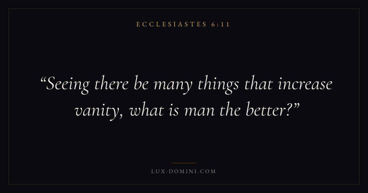 Books / Ecclesiastes / Chapter 6 / Verse 11 ← Ecclesiastes 6:10 Ecclesiastes 6:11 Ecclesiastes 6:12 → Seeing there be many things that increase vanity, what is man the better? Download verse card Share on Twitter Share on Facebook Pin it ✦ Key themes WisdomVanityTimeDeath Read with Ecclesiastes 6:12Proverbs 1:7James 1:5 Related topics Bible verses about wisdomBible verses about death and dying ✦ Ecclesiastes Chapter 6 verses V. 1 V. 2 V. 3 V. 4 V. 5 V. 6 V. 7 V. 8 V. 9 V. 10 V. 11 V. 12