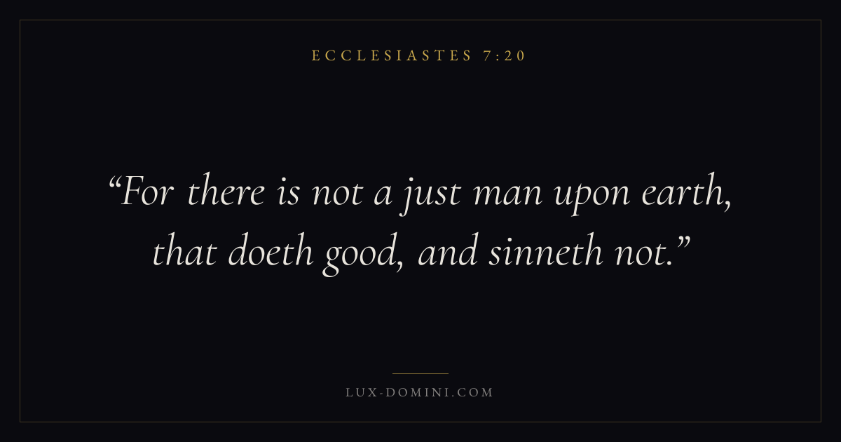 Books / Ecclesiastes / Chapter 7 / Verse 20 ← Ecclesiastes 7:19 Ecclesiastes 7:20 Ecclesiastes 7:21 → For there is not a just man upon earth, that doeth good, and sinneth not. Download verse card Share on Twitter Share on Facebook Pin it ✦ Key themes WisdomVanityTimeDeath Read with Ecclesiastes 7:19Proverbs 1:7James 1:5 Related topics Bible verses about wisdomBible verses about death and dying ✦ Ecclesiastes Chapter 7 verses V. 1 V. 2 V. 3 V. 4 V. 5 V. 6 V. 7 V. 8 V. 9 V. 10 V. 11 V. 12 V. 13 V. 14 V. 15 V. 16 V. 17 V. 18 V. 19 V. 20 V. 21 V. 22 V. 23 V. 24 V. 25 V. 26 V. 27 V. 28 V. 29