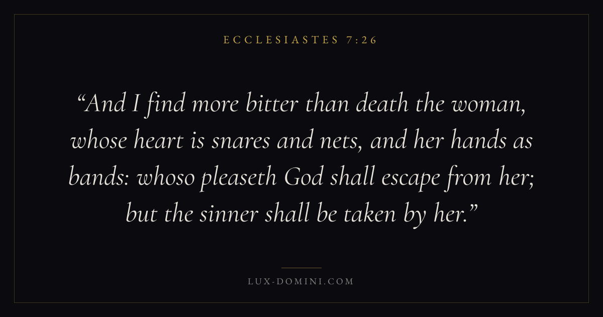 And I find more bitter than death the woman, whose heart is snares and nets, and her hands as bands: whoso pleaseth God shall escape from her; but the sinner shall be taken by her.