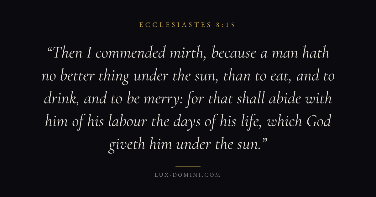 Then I commended mirth, because a man hath no better thing under the sun, than to eat, and to drink, and to be merry: for that shall abide with him of his labour the days of his life, which God giveth him under the sun.