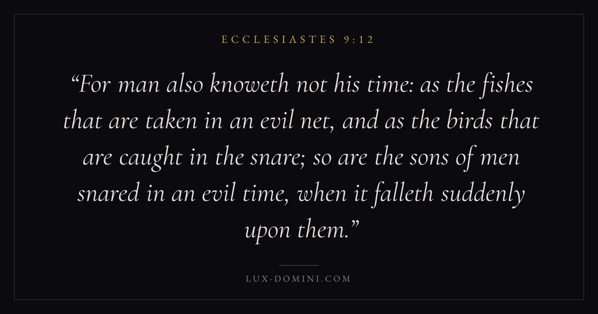 For man also knoweth not his time: as the fishes that are taken in an evil net, and as the birds that are caught in the snare; so are the sons of men snared in an evil time, when it falleth suddenly upon them.