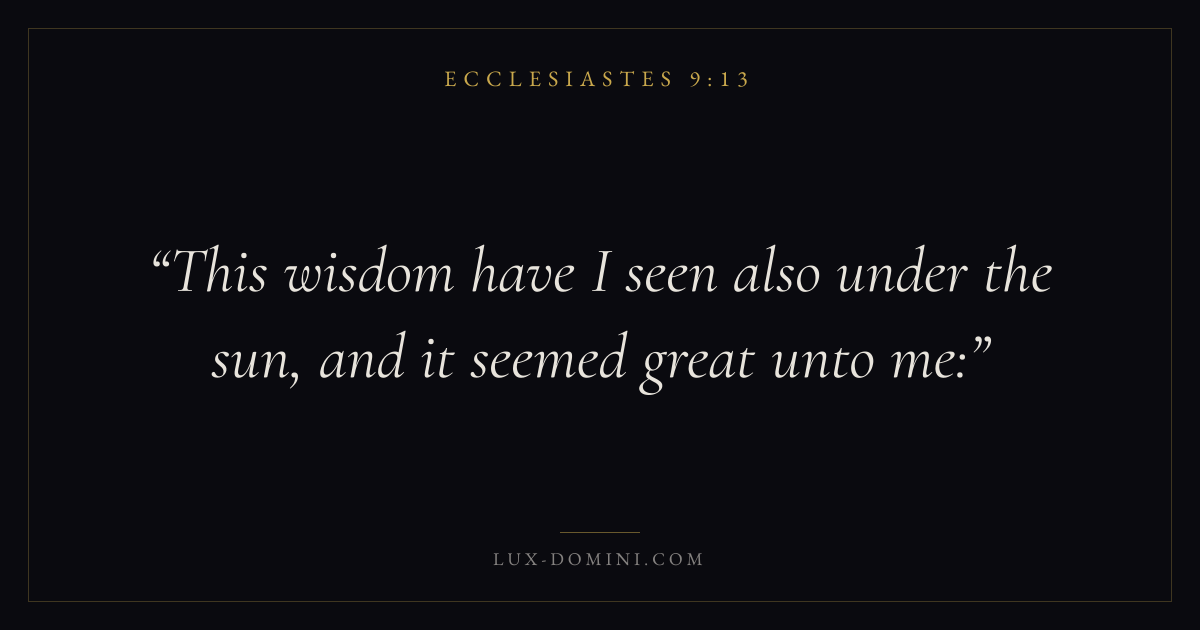 Books / Ecclesiastes / Chapter 9 / Verse 13 ← Ecclesiastes 9:12 Ecclesiastes 9:13 Ecclesiastes 9:14 → This wisdom have I seen also under the sun, and it seemed great unto me: Download verse card Share on Twitter Share on Facebook Pin it ✦ Key themes WisdomVanityTimeDeath Read with Ecclesiastes 9:14Ecclesiastes 9:15Proverbs 1:7James 1:5 Related topics Bible verses about wisdomBible verses about death and dying ✦ Ecclesiastes Chapter 9 verses V. 1 V. 2 V. 3 V. 4 V. 5 V. 6 V. 7 V. 8 V. 9 V. 10 V. 11 V. 12 V. 13 V. 14 V. 15 V. 16 V. 17 V. 18