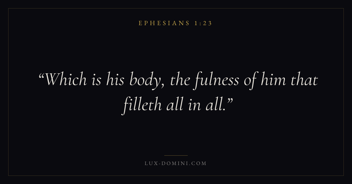Books / Ephesians / Chapter 1 / Verse 23 ← Ephesians 1:22 Ephesians 1:23 Ephesians 2:1 → Which is his body, the fulness of him that filleth all in all. Download verse card Share on Twitter Share on Facebook Pin it ✦ Key themes PrayerGraceUnion with ChristChurch Read with Ephesians 1:20Ephesians 1:21Matthew 6:9Luke 18:1 Related topics Bible verses about prayerBible verses about grace ✦ Ephesians Chapter 1 verses V. 1 V. 2 V. 3 V. 4 V. 5 V. 6 V. 7 V. 8 V. 9 V. 10 V. 11 V. 12 V. 13 V. 14 V. 15 V. 16 V. 17 V. 18 V. 19 V. 20 V. 21 V. 22 V. 23
