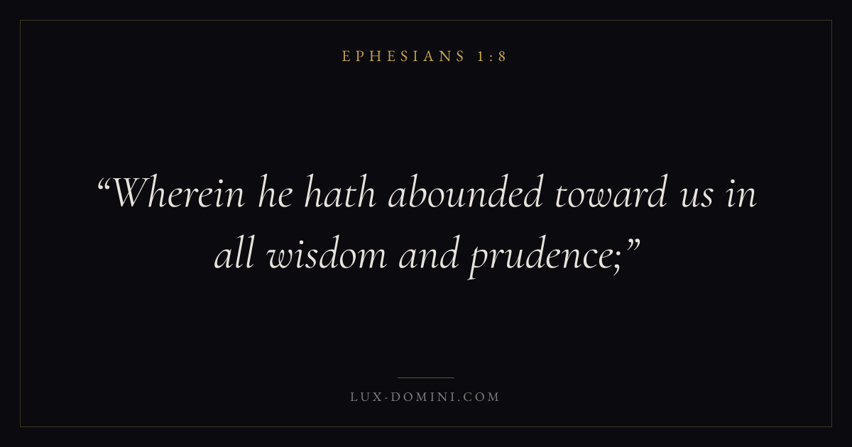 Books / Ephesians / Chapter 1 / Verse 8 ← Ephesians 1:7 Ephesians 1:8 Ephesians 1:9 → Wherein he hath abounded toward us in all wisdom and prudence; Download verse card Share on Twitter Share on Facebook Pin it ✦ Key themes WisdomGraceUnion with ChristChurch Read with Ephesians 1:7Ephesians 1:9Proverbs 1:7James 1:5 Related topics Bible verses about wisdomBible verses about grace ✦ Ephesians Chapter 1 verses V. 1 V. 2 V. 3 V. 4 V. 5 V. 6 V. 7 V. 8 V. 9 V. 10 V. 11 V. 12 V. 13 V. 14 V. 15 V. 16 V. 17 V. 18 V. 19 V. 20 V. 21 V. 22 V. 23