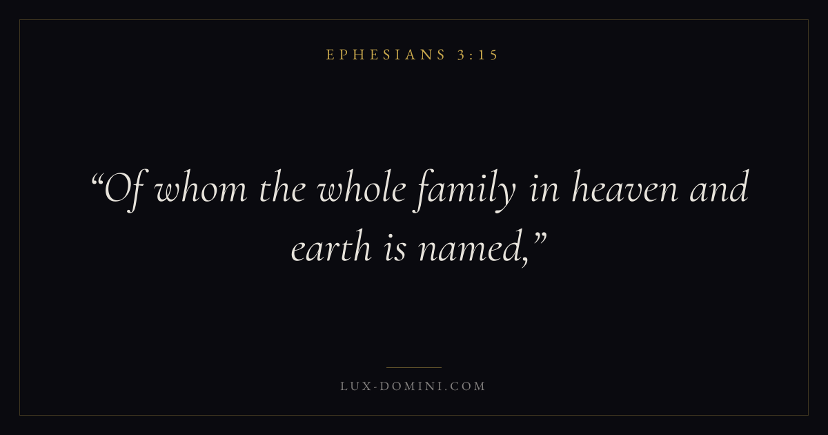 Books / Ephesians / Chapter 3 / Verse 15 ← Ephesians 3:14 Ephesians 3:15 Ephesians 3:16 → Of whom the whole family in heaven and earth is named, Download verse card Share on Twitter Share on Facebook Pin it ✦ Key themes Anxiety and fearGraceUnion with ChristChurch Read with Ephesians 3:13Ephesians 3:14Philippians 4:6Isaiah 41:10 Related topics Bible verses about anxiety and fearBible verses about grace ✦ Ephesians Chapter 3 verses V. 1 V. 2 V. 3 V. 4 V. 5 V. 6 V. 7 V. 8 V. 9 V. 10 V. 11 V. 12 V. 13 V. 14 V. 15 V. 16 V. 17 V. 18 V. 19 V. 20 V. 21