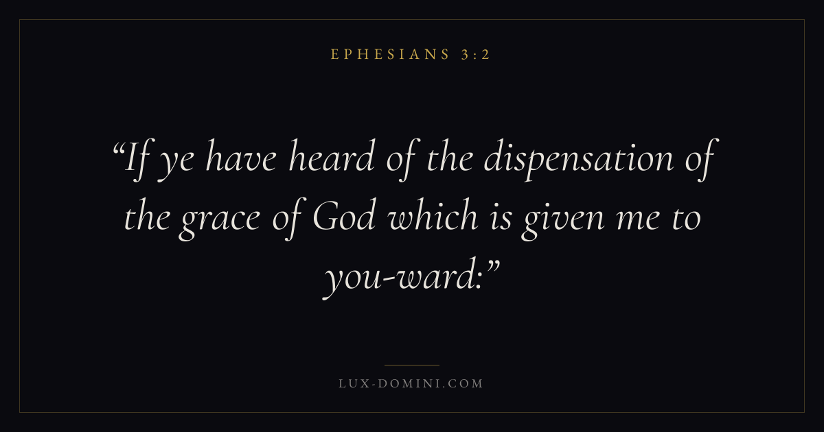 Books / Ephesians / Chapter 3 / Verse 2 ← Ephesians 3:1 Ephesians 3:2 Ephesians 3:3 → If ye have heard of the dispensation of the grace of God which is given me to you-ward: Download verse card Share on Twitter Share on Facebook Pin it ✦ Key themes Suffering and trialsGraceTruthUnion with Christ Read with Ephesians 3:1Ephesians 3:3Romans 8:182 Corinthians 4:17 Related topics Bible verses about suffering and trialsBible verses about graceBible verses about truth ✦ Ephesians Chapter 3 verses V. 1 V. 2 V. 3 V. 4 V. 5 V. 6 V. 7 V. 8 V. 9 V. 10 V. 11 V. 12 V. 13 V. 14 V. 15 V. 16 V. 17 V. 18 V. 19 V. 20 V. 21