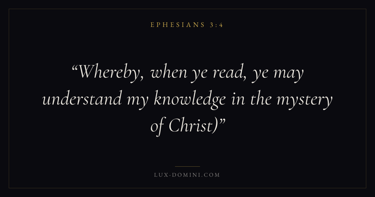 Books / Ephesians / Chapter 3 / Verse 4 ← Ephesians 3:3 Ephesians 3:4 Ephesians 3:5 → Whereby, when ye read, ye may understand my knowledge in the mystery of Christ) Download verse card Share on Twitter Share on Facebook Pin it ✦ Key themes Suffering and trialsWisdomGraceTruthUnion with Christ Read with Ephesians 3:1Ephesians 3:2Romans 8:182 Corinthians 4:17 Related topics Bible verses about suffering and trialsBible verses about wisdomBible verses about graceBible verses about truth ✦ Ephesians Chapter 3 verses V. 1 V. 2 V. 3 V. 4 V. 5 V. 6 V. 7 V. 8 V. 9 V. 10 V. 11 V. 12 V. 13 V. 14 V. 15 V. 16 V. 17 V. 18 V. 19 V. 20 V. 21