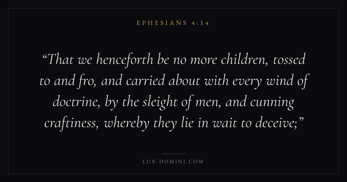That we henceforth be no more children, tossed to and fro, and carried about with every wind of doctrine, by the sleight of men, and cunning craftiness, whereby they lie in wait to deceive;