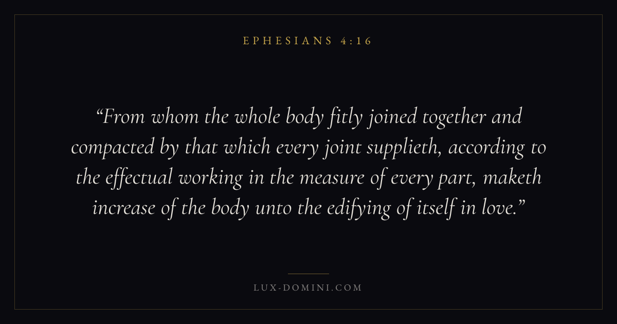 From whom the whole body fitly joined together and compacted by that which every joint supplieth, according to the effectual working in the measure of every part, maketh increase of the body unto the edifying of itself in love.