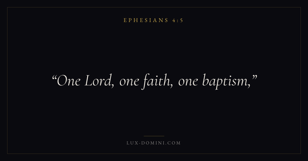 Books / Ephesians / Chapter 4 / Verse 5 ← Ephesians 4:4 Ephesians 4:5 Ephesians 4:6 → One Lord, one faith, one baptism, Download verse card Share on Twitter Share on Facebook Pin it ✦ Key themes FaithGraceHumilityUnion with Christ Read with Ephesians 4:4Ephesians 4:6Hebrews 11:1Romans 10:17 Related topics Bible verses about faithBible verses about graceBible verses about humility ✦ Ephesians Chapter 4 verses V. 1 V. 2 V. 3 V. 4 V. 5 V. 6 V. 7 V. 8 V. 9 V. 10 V. 11 V. 12 V. 13 V. 14 V. 15 V. 16 V. 17 V. 18 V. 19 V. 20 V. 21 V. 22 V. 23 V. 24 V. 25 V. 26 V. 27 V. 28 V. 29 V. 30 V. 31 V. 32