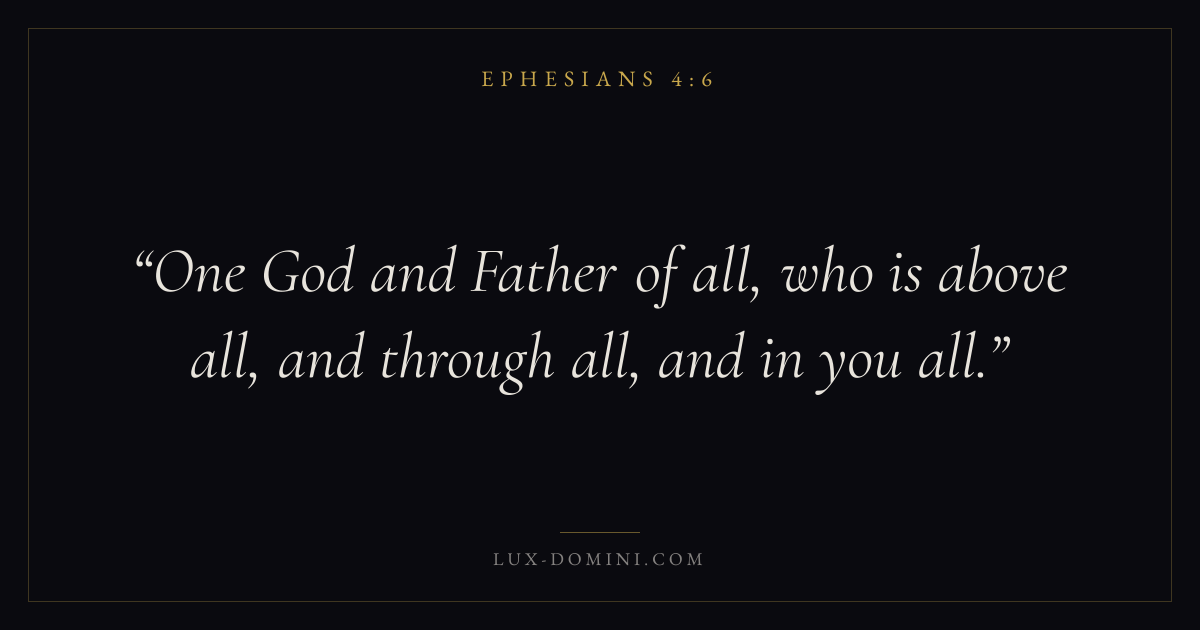 Books / Ephesians / Chapter 4 / Verse 6 ← Ephesians 4:5 Ephesians 4:6 Ephesians 4:7 → One God and Father of all, who is above all, and through all, and in you all. Download verse card Share on Twitter Share on Facebook Pin it ✦ Key themes GraceHumilityUnion with ChristChurch Read with Ephesians 4:4Ephesians 4:5Ephesians 2:82 Corinthians 12:9 Related topics Bible verses about graceBible verses about humility ✦ Ephesians Chapter 4 verses V. 1 V. 2 V. 3 V. 4 V. 5 V. 6 V. 7 V. 8 V. 9 V. 10 V. 11 V. 12 V. 13 V. 14 V. 15 V. 16 V. 17 V. 18 V. 19 V. 20 V. 21 V. 22 V. 23 V. 24 V. 25 V. 26 V. 27 V. 28 V. 29 V. 30 V. 31 V. 32