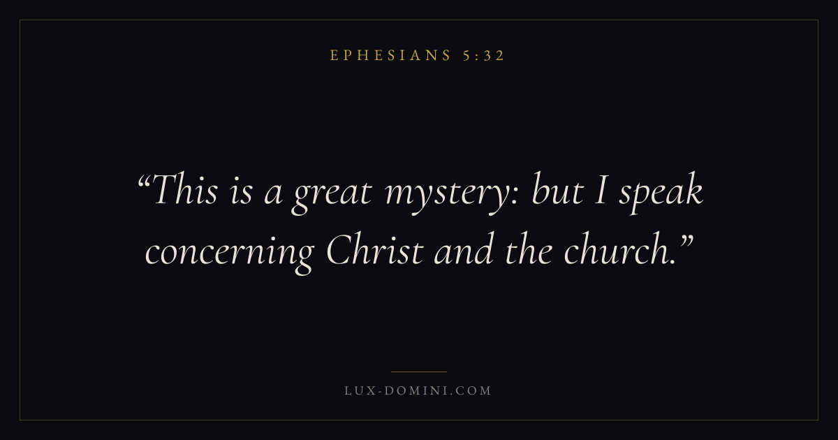 Books / Ephesians / Chapter 5 / Verse 32 ← Ephesians 5:31 Ephesians 5:32 Ephesians 5:33 → This is a great mystery: but I speak concerning Christ and the church. Download verse card Share on Twitter Share on Facebook Pin it ✦ Key themes LoveGraceUnion with ChristChurch Read with Ephesians 5:33John 3:161 Corinthians 13:4Ephesians 2:8 Related topics Bible verses about loveBible verses about grace ✦ Ephesians Chapter 5 verses V. 1 V. 2 V. 3 V. 4 V. 5 V. 6 V. 7 V. 8 V. 9 V. 10 V. 11 V. 12 V. 13 V. 14 V. 15 V. 16 V. 17 V. 18 V. 19 V. 20 V. 21 V. 22 V. 23 V. 24 V. 25 V. 26 V. 27 V. 28 V. 29 V. 30 V. 31 V. 32 V. 33